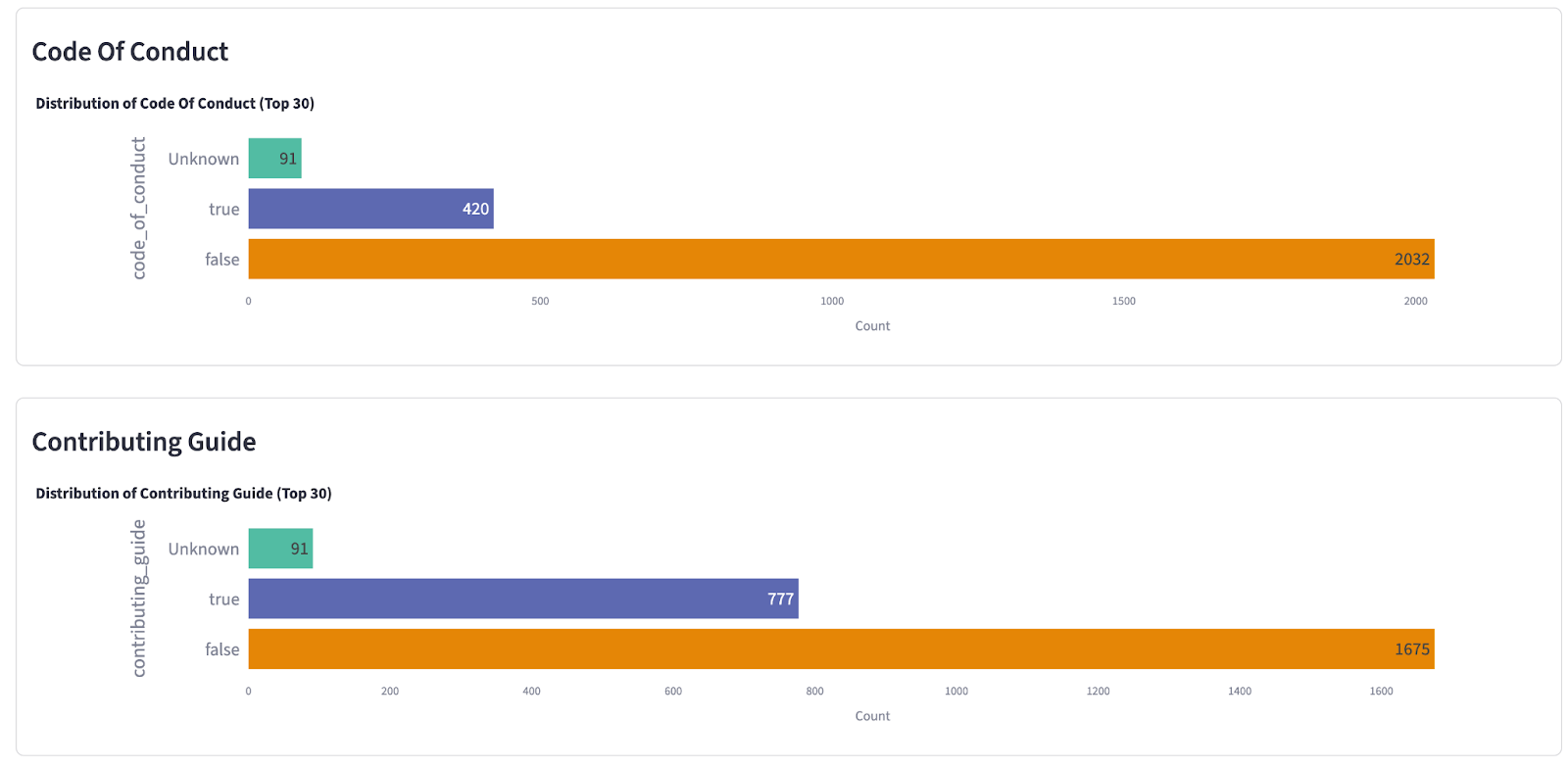 I wondered why it felt so hard to jump into some of these amazing projects. We analyzed the “Social Attributes” of 2,500+ projects and found a glaring issue. Based on our current citation data, * 2,032 projects have no code of conduct. * 1,675 projects lack a contributing guide.