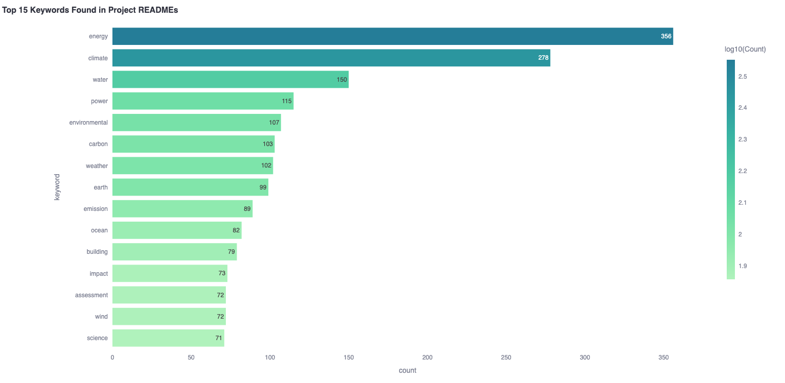 Topical Focus: Energy systems, climate change, and the biosphere dominate the distribution of projects, with keywords like “energy,” “climate,” and “water” being the most frequently extracted.