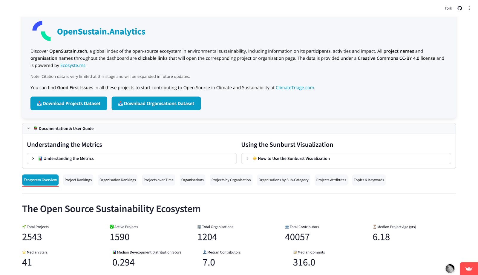 The Dashboard uses the manually curated datasets of organizations and projects in the Open Sustain Tech ecosystem, to create an up-to-date and ready to explore framework for anyone to understand the dataset. The analytics tool provides users with a dynamic, collaborative workspace to quantify the health, impact, and growth of the open-source movement in climate change mitigation and sustainability.