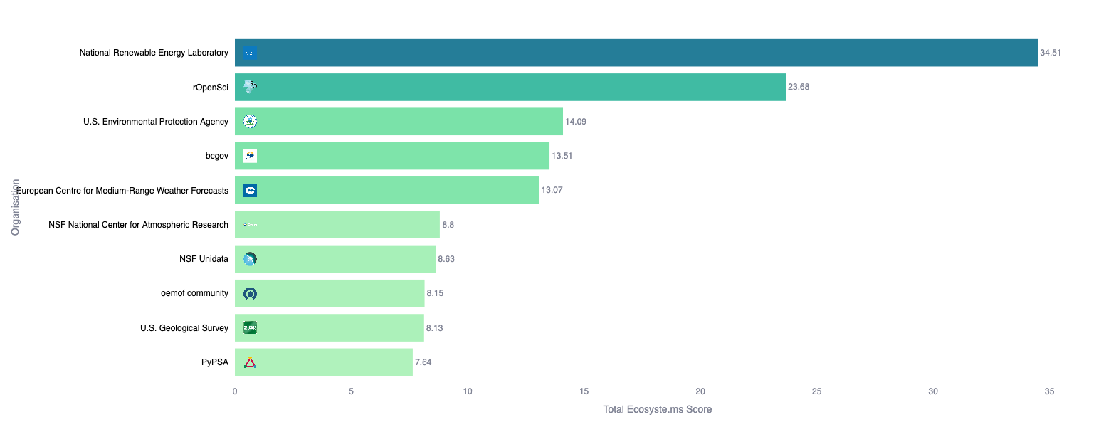 The National Renewable Energy Laboratory (NREL), now the National Laboratory of the Rockies (NLR), and rOpenSci are absolute powerhouses, consistently outperforming private entities in both project volume and community health.